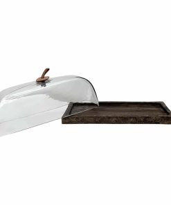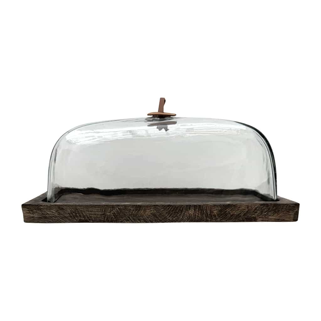 Le Présentoir Cloche Rectangulaire, allie fonctionnalité et esthétique naturelle. Présentoir à gâteau en bois de manguier avec cloche en verre et anse en simili cuir marron.